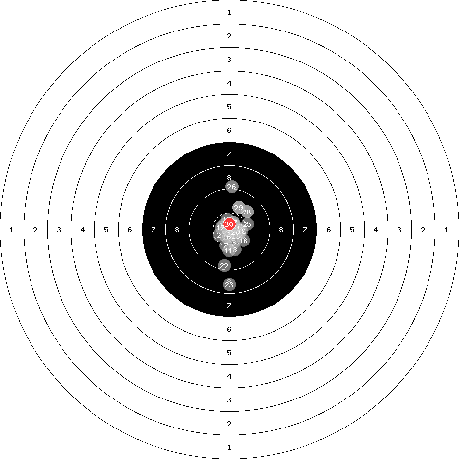 hit position: 1.24 mm right, 0.89 mm low