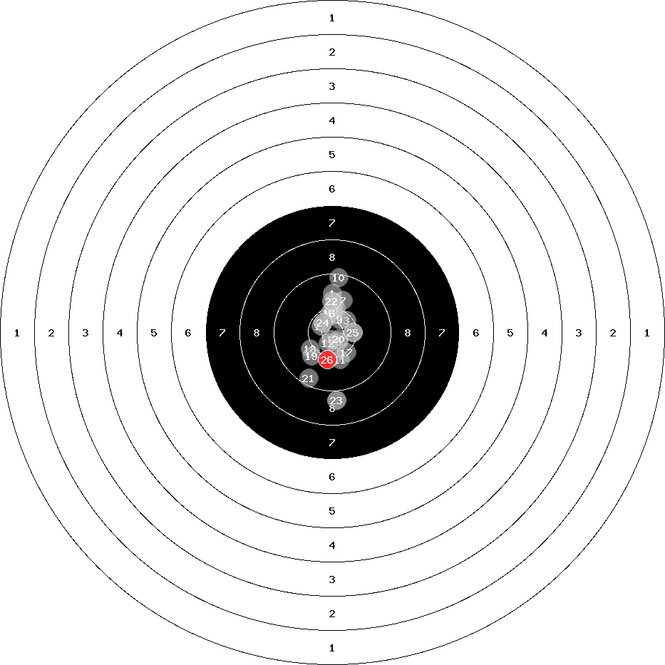 hit position: 0.74 mm left, 0.9 mm low