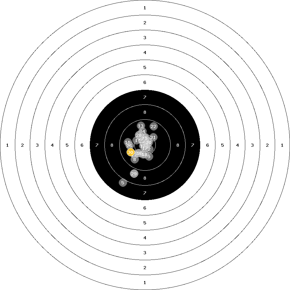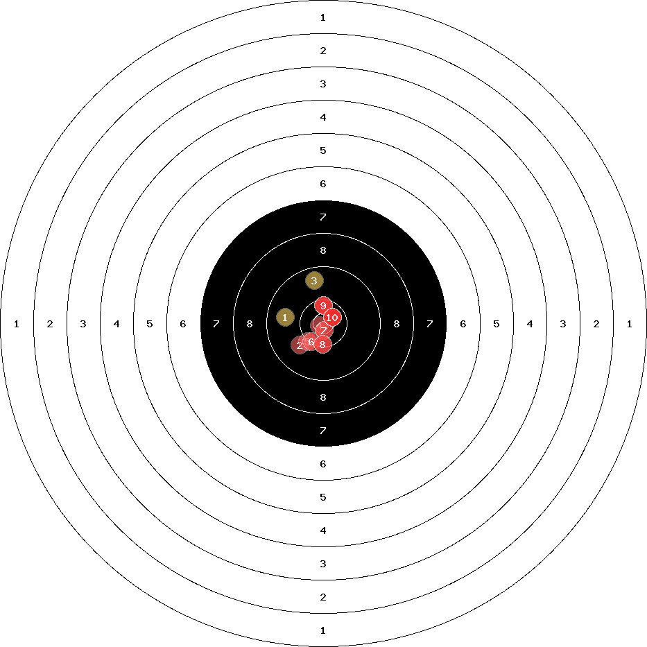 hit position: 2.33 mm left, 0.34 mm low