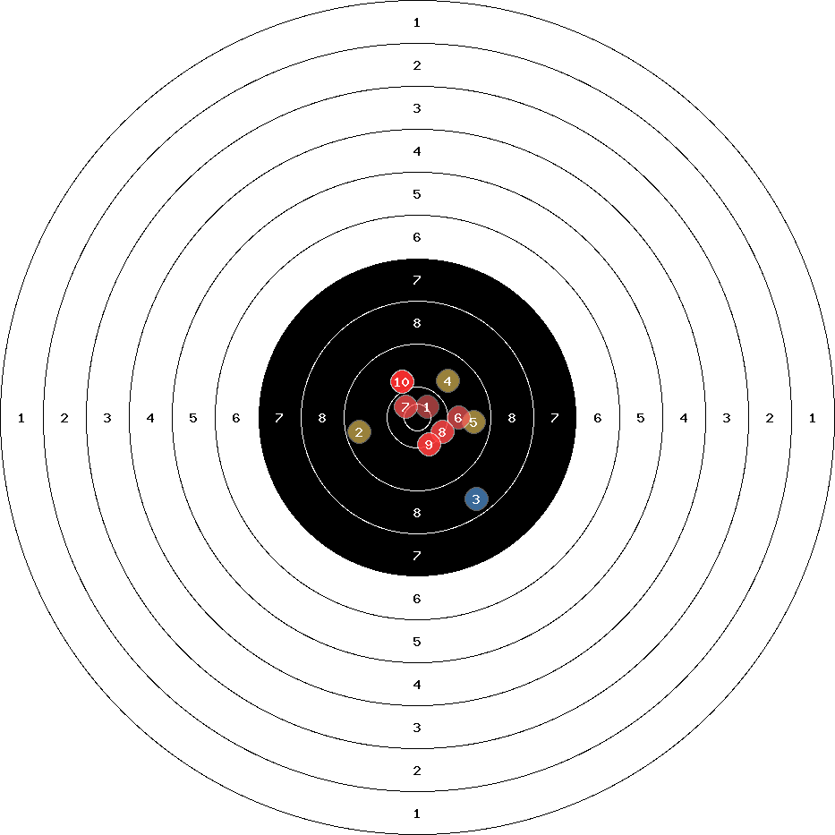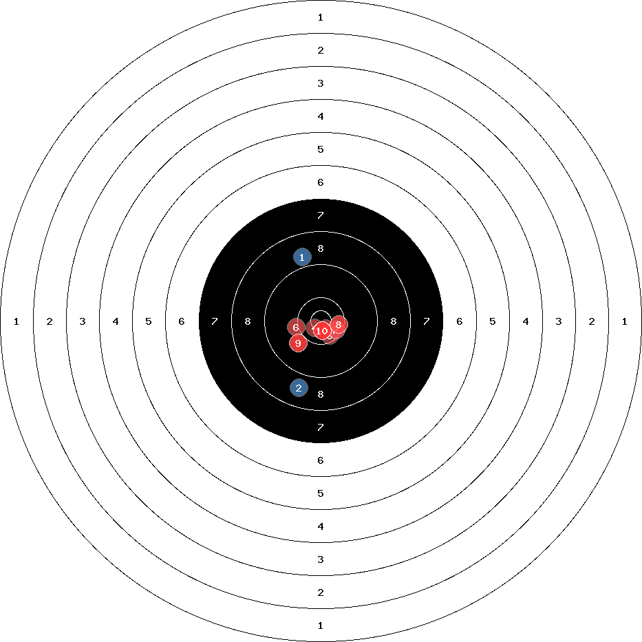 hit position: 2.81 mm right, 0.9 mm low