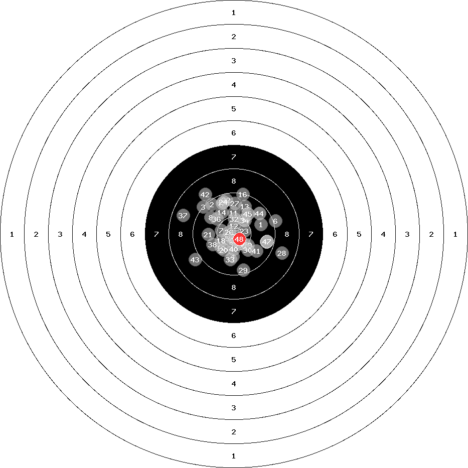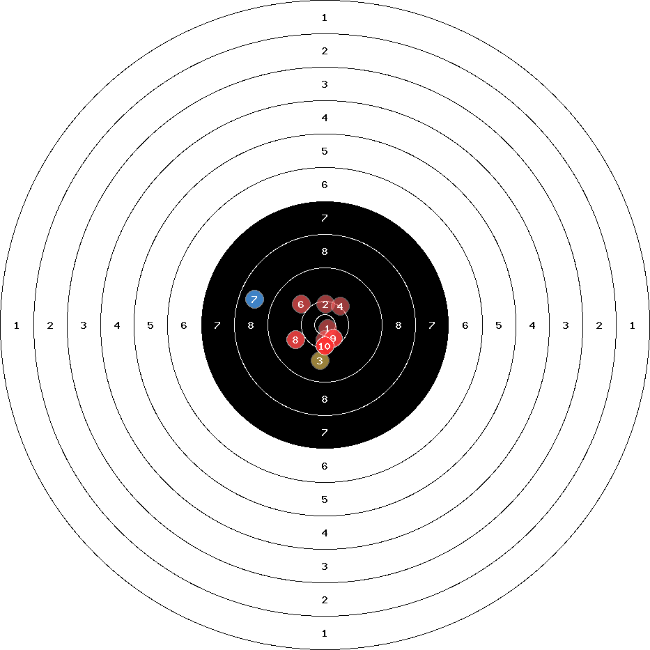 hit position: 2.43 mm left, 0.4 mm low